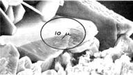 ![]() | Cell with crystalline formation. Crystals have grown to 50 -100 microns in cross section, concealing large portions of the active material from the electrolyte. Jagged edges and sharp corners can pierce the separator, leading to increased self-discharge or electrical short. |